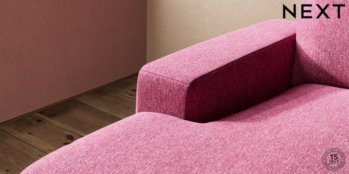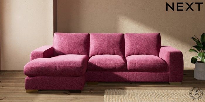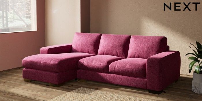 7.2.10 Houghton Deep Relaxed Sit Medium Sofa Chaise - Left Hand Cotswold Chenille Dark Raspberry Pink Large Square Angle - Brushed Brass | Made Click here to use our website with more accessibility support, for example screen readers