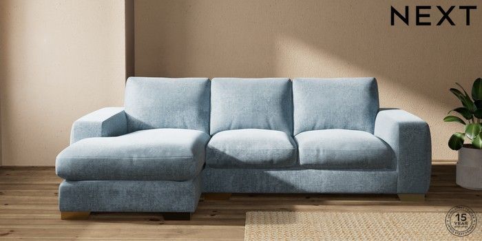 7.2.10 Houghton Deep Relaxed Sit Medium Sofa Chaise - Left Hand Plush Chenille Light Blue Large Square Angle - Brushed Brass | Made Click here to use our website with more accessibility support, for example screen readers
