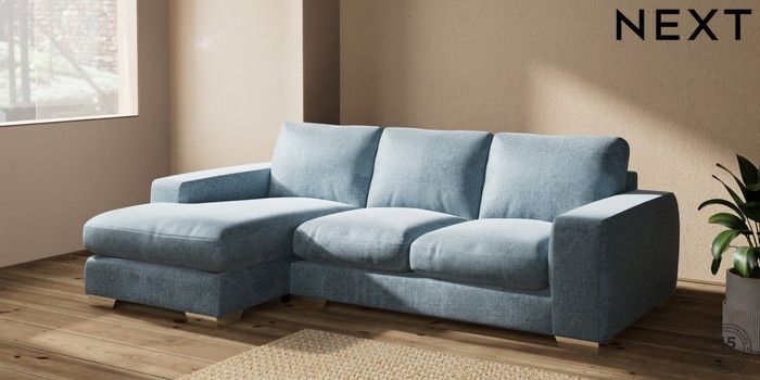 7.2.10 Houghton Deep Relaxed Sit Medium Sofa Chaise - Left Hand Plush Chenille Light Blue Large Square Angle - Chrome Metal | Made Click here to use our website with more accessibility support, for example screen readers