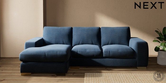 7.2.10 Houghton Deep Relaxed Sit Medium Sofa Chaise - Left Hand Ripple Chenille Dark Blue Large Square Angle - Brushed Brass | Made Click here to use our website with more accessibility support, for example screen readers