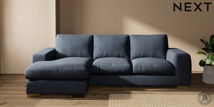 7.2.10 Houghton Deep Relaxed Sit Medium Sofa Chaise - Left Hand Tweedy Chenille Navy Blue Large Square Angle - Brushed Brass | Made Click here to use our website with more accessibility support, for example screen readers
