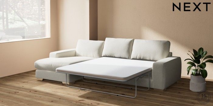 7.2.10 Houghton Deep Relaxed Sit Sofa Chaise Bed - Left Hand Chunky Texture Oyster Large Square Angle - Chrome Metal | Made Click here to use our website with more accessibility support, for example screen readers