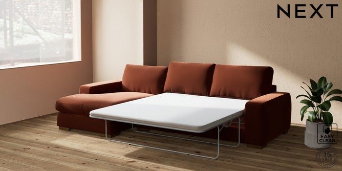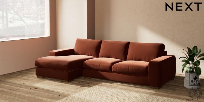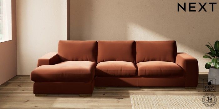 7.2.10 Houghton Deep Relaxed Sit Sofa Chaise Bed - Left Hand Plush Velvet Easy Clean Ginger Orange Large Square Angle - Mid | Made Click here to use our website with more accessibility support, for example screen readers