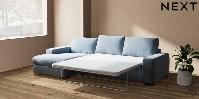 7.2.10 Houghton Deep Relaxed Sit Sofa Chaise Bed - Left Hand Relaxed Linen Look Mid Blue Large Square Angle - Brushed Brass | Made Click here to use our website with more accessibility support, for example screen readers
