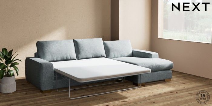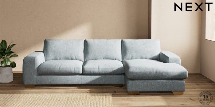 7.2.10 Houghton Deep Relaxed Sit Sofa Chaise Bed - Right Hand Chunky Weave Mid Blue Large Square Angle - Brushed Brass | Made Click here to use our website with more accessibility support, for example screen readers