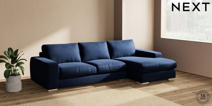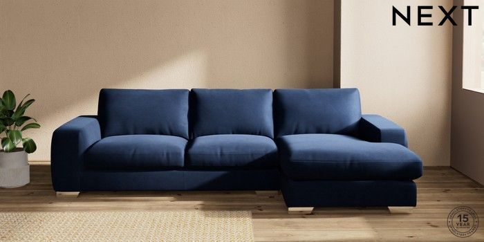 7.2.10 Houghton Deep Relaxed Sit Sofa Chaise Bed - Right Hand Luxe Chenille Navy Blue Large Square Angle - Chrome Metal | Made Click here to use our website with more accessibility support, for example screen readers