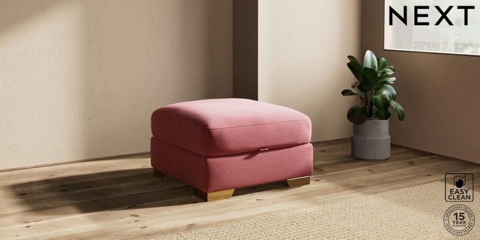 7.2.10 Houghton Deep Relaxed Sit Storage Footstool Fine Chenille Easy Clean Mid Pink Square Angle - Brushed Brass | Made Click here to use our website with more accessibility support, for example screen readers