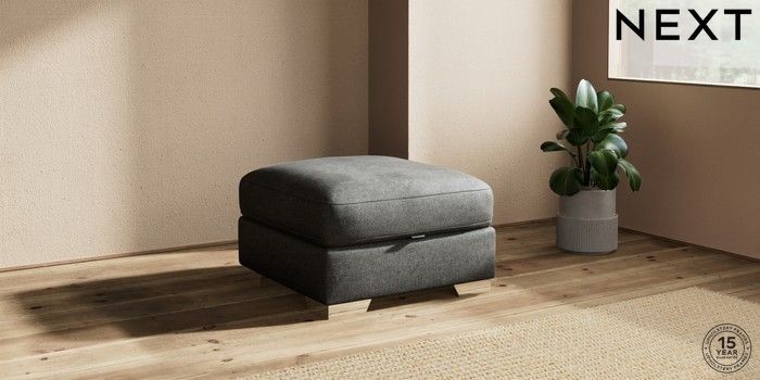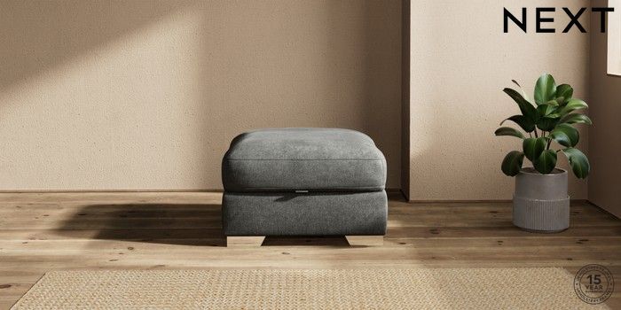 7.2.10 Houghton Deep Relaxed Sit Storage Footstool Plush Chenille Dark Grey Square Angle - Chrome Metal | Made Click here to use our website with more accessibility support, for example screen readers