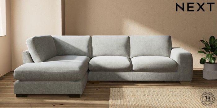 7.2.10 Houghton Deep Sit Large Corner Chaise - Left Hand Chunky Chenille Light Grey Large Square Angle - Brushed Brass | Made Click here to use our website with more accessibility support, for example screen readers