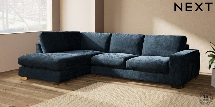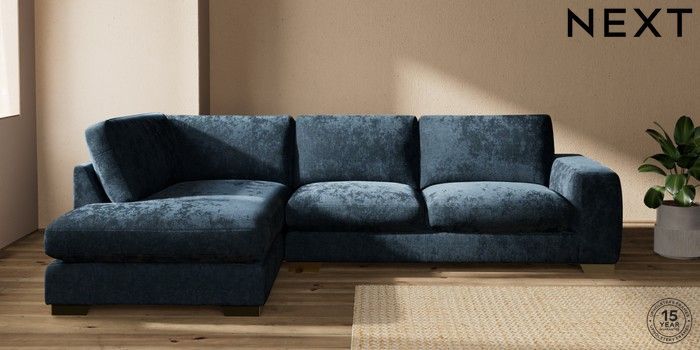 7.2.10 Houghton Deep Sit Large Corner Chaise - Left Hand Distressed Velour Midnight Blue Large Square Angle - Brushed Brass | Made Click here to use our website with more accessibility support, for example screen readers