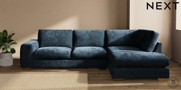 7.2.10 Houghton Deep Sit Large Corner Chaise - Right Hand Distressed Velour Midnight Blue Large Square Angle - Brushed Brass | Made Click here to use our website with more accessibility support, for example screen readers