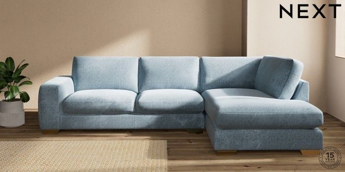 7.2.10 Houghton Deep Sit Large Corner Chaise - Right Hand Plush Chenille Light Blue Large Square Angle - Brushed Brass | Made Click here to use our website with more accessibility support, for example screen readers