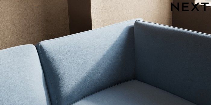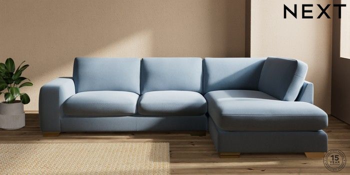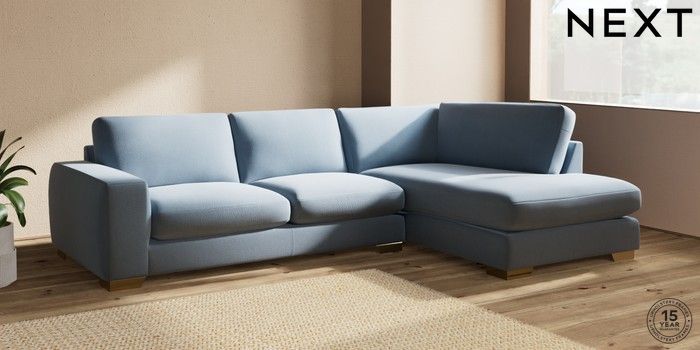 7.2.10 Houghton Deep Sit Large Corner Chaise - Right Hand Relaxed Linen Look Mid Blue Large Square Angle - Brushed Brass | Made Click here to use our website with more accessibility support, for example screen readers