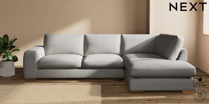 7.2.10 Houghton Deep Sit Large Corner Chaise - Right Hand Woven Chenille Easy Clean Light Grey Large Square Angle - Brushed Brass | Made Click here to use our website with more accessibility support, for example screen readers