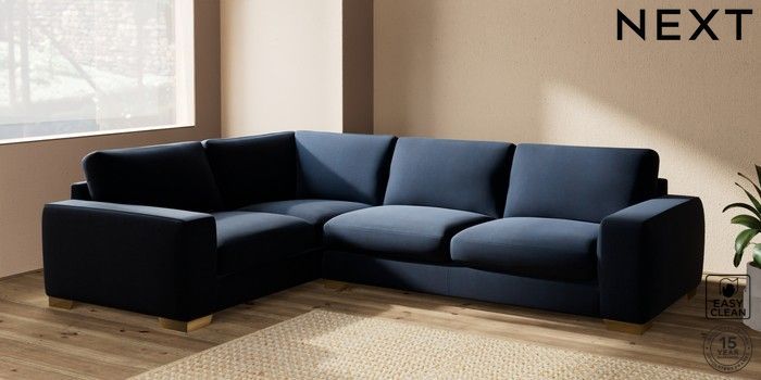 7.2.10 Houghton Deep Sit Large Corner Sofa - Left Hand Fine Chenille Easy Clean Dark Navy Blue Large Square Angle - Brushed Brass | Made Click here to use our website with more accessibility support, for example screen readers