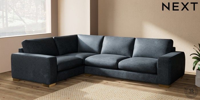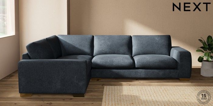 7.2.10 Houghton Deep Sit Large Corner Sofa - Left Hand Plush Chenille Slate Blue Large Square Angle - Brushed Brass | Made Click here to use our website with more accessibility support, for example screen readers