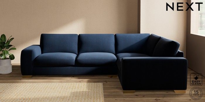 7.2.10 Houghton Deep Sit Large Corner Sofa - Right Hand Fine Chenille Easy Clean Dark Navy Blue Large Square Angle - Brushed Brass | Made Click here to use our website with more accessibility support, for example screen readers