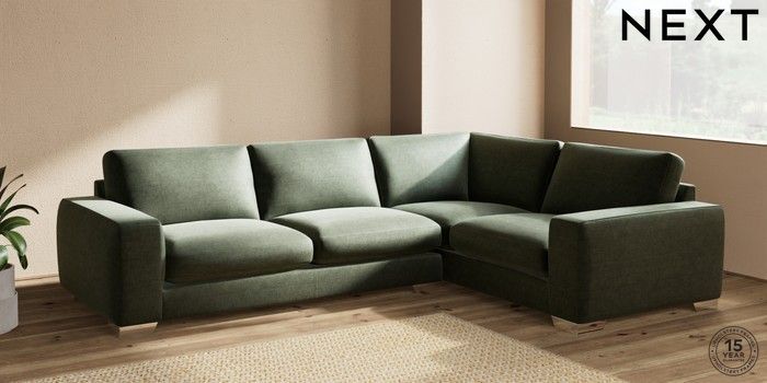 7.2.10 Houghton Deep Sit Large Corner Sofa - Right Hand Luxe Chenille Mid Green Large Square Angle - Chrome Metal | Made Click here to use our website with more accessibility support, for example screen readers