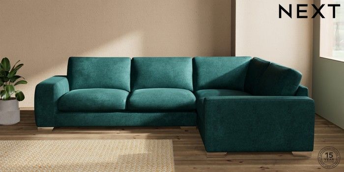 7.2.10 Houghton Deep Sit Large Corner Sofa - Right Hand Plush Chenille Dark Teal Green Large Square Angle - Chrome Metal | Made Click here to use our website with more accessibility support, for example screen readers