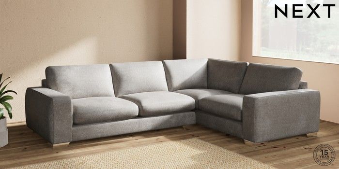 7.2.10 Houghton Deep Sit Large Corner Sofa - Right Hand Plush Chenille Light Grey Large Square Angle - Chrome Metal | Made Click here to use our website with more accessibility support, for example screen readers