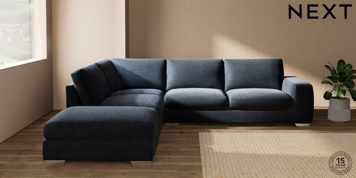 7.2.10 Houghton Deep Sit Large Open End Corner Chaise - Left Hand Boucle Chenille Dark Slate Blue Large Square Angle - Chrome Metal | Made Click here to use our website with more accessibility support, for example screen readers