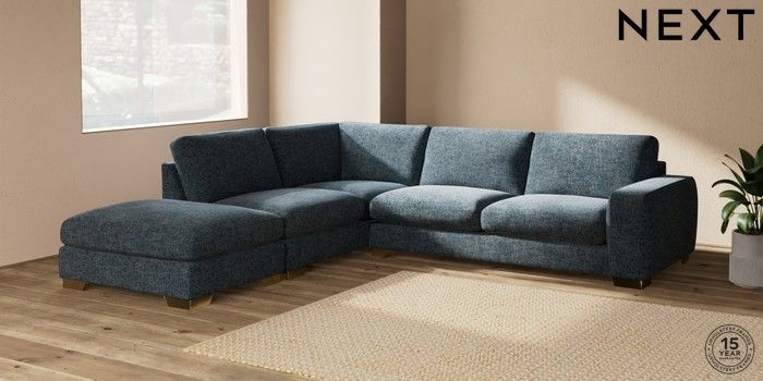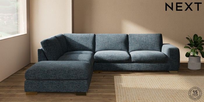 7.2.10 Houghton Deep Sit Large Open End Corner Chaise - Left Hand Chunky Chenille Dark Navy Blue Large Square Angle - Brushed Brass | Made Click here to use our website with more accessibility support, for example screen readers