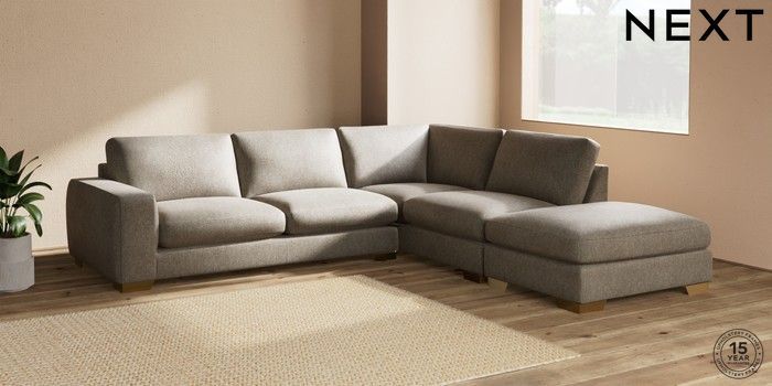 7.2.10 Houghton Deep Sit Large Open End Corner Chaise - Right Hand Cotswold Chenille Mid Mink Brown Large Square Angle - Brushed Brass | Made Click here to use our website with more accessibility support, for example screen readers