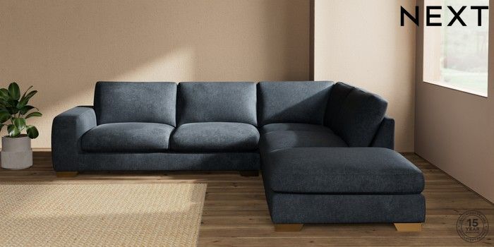7.2.10 Houghton Deep Sit Large Open End Corner Chaise - Right Hand Plush Chenille Slate Blue Large Square Angle - Brushed Brass | Made Click here to use our website with more accessibility support, for example screen readers