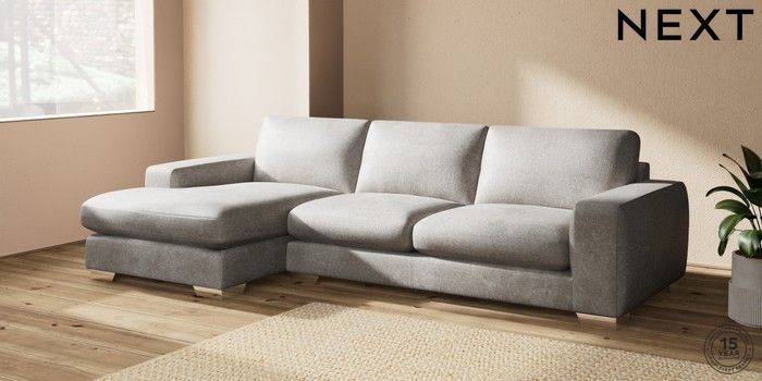 7.2.10 Houghton Deep Sit Large Sofa Chaise - Left Hand Plush Chenille Light Grey Large Square Angle - Chrome Metal | Made Click here to use our website with more accessibility support, for example screen readers