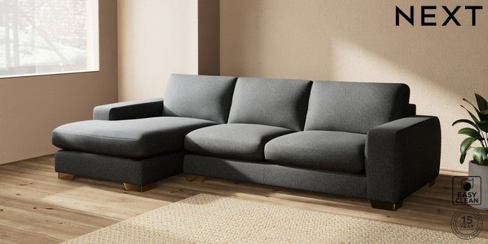 7.2.10 Houghton Deep Sit Large Sofa Chaise - Left Hand Tweedy Blend Easy Clean Charcoal Grey Large Square Angle - Brushed Brass | Made Click here to use our website with more accessibility support, for example screen readers