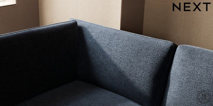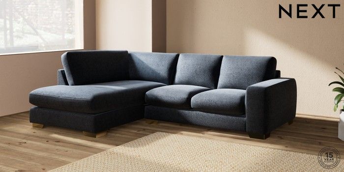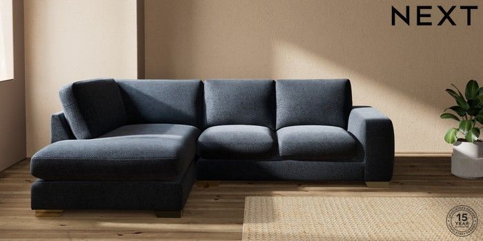 7.2.10 Houghton Deep Sit Medium Corner Chaise - Left Hand Boucle Chenille Dark Slate Blue Large Square Angle - Brushed Brass | Made Click here to use our website with more accessibility support, for example screen readers