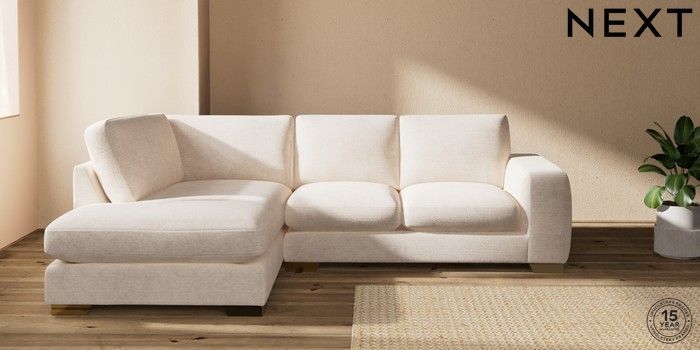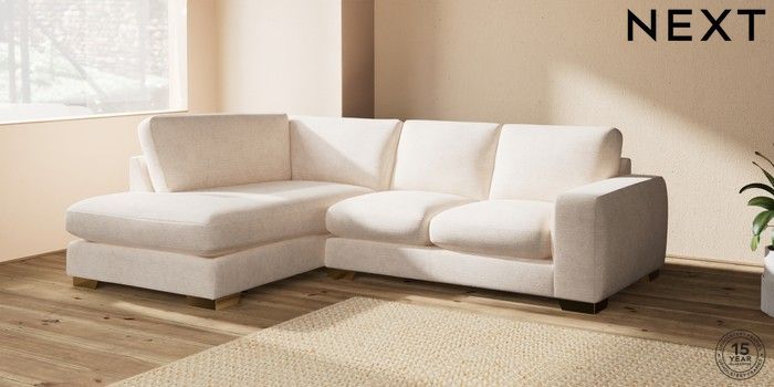 7.2.10 Houghton Deep Sit Medium Corner Chaise - Left Hand Boucle Chenille Oyster Large Square Angle - Brushed Brass | Made Click here to use our website with more accessibility support, for example screen readers