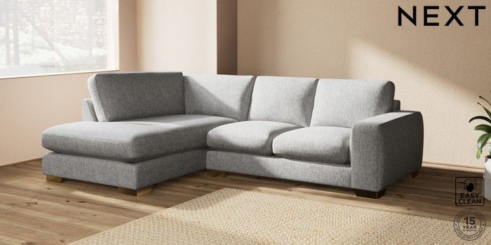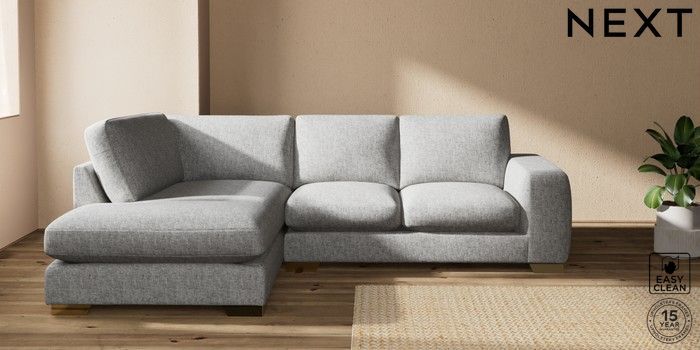 7.2.10 Houghton Deep Sit Medium Corner Chaise - Left Hand Chunky Boucle Easy Clean Light Grey Large Square Angle - Brushed Brass | Made Click here to use our website with more accessibility support, for example screen readers