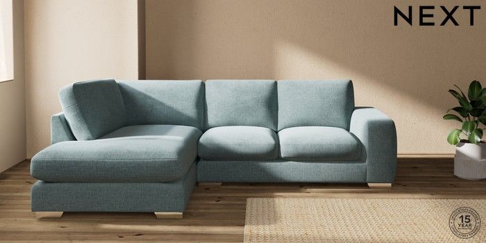 7.2.10 Houghton Deep Sit Medium Corner Chaise - Left Hand Chunky Chenille Light Teal Green Large Square Angle - Chrome Metal | Made Click here to use our website with more accessibility support, for example screen readers