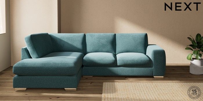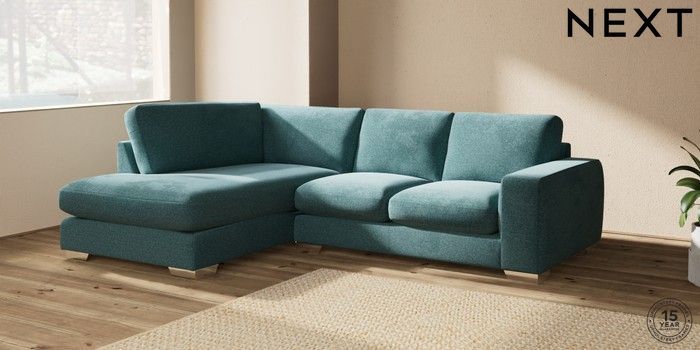 7.2.10 Houghton Deep Sit Medium Corner Chaise - Left Hand Chunky Chenille Mid Teal Green Large Square Angle - Chrome Metal | Made Click here to use our website with more accessibility support, for example screen readers