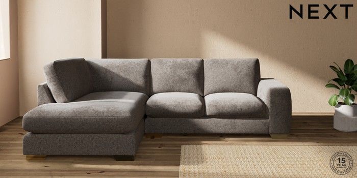 7.2.10 Houghton Deep Sit Medium Corner Chaise - Left Hand Chunky Chenille Mink Brown Large Square Angle - Brushed Brass | Made Click here to use our website with more accessibility support, for example screen readers