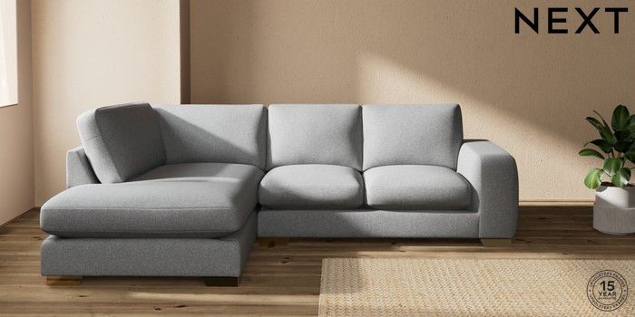 7.2.10 Houghton Deep Sit Medium Corner Chaise - Left Hand Chunky Weave Mid Grey Large Square Angle - Brushed Brass | Made Click here to use our website with more accessibility support, for example screen readers