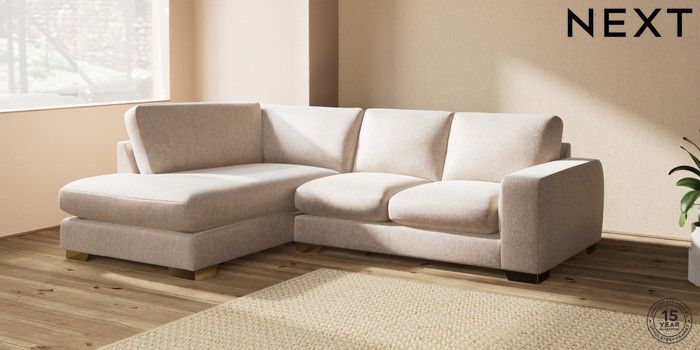 7.2.10 Houghton Deep Sit Medium Corner Chaise - Left Hand Cotswold Chenille Light Natural Large Square Angle - Brushed Brass | Made Click here to use our website with more accessibility support, for example screen readers