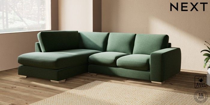 7.2.10 Houghton Deep Sit Medium Corner Chaise - Left Hand Fine Chenille Easy Clean Mid Khaki Green Large Square Angle - Chrome Metal | Made Click here to use our website with more accessibility support, for example screen readers