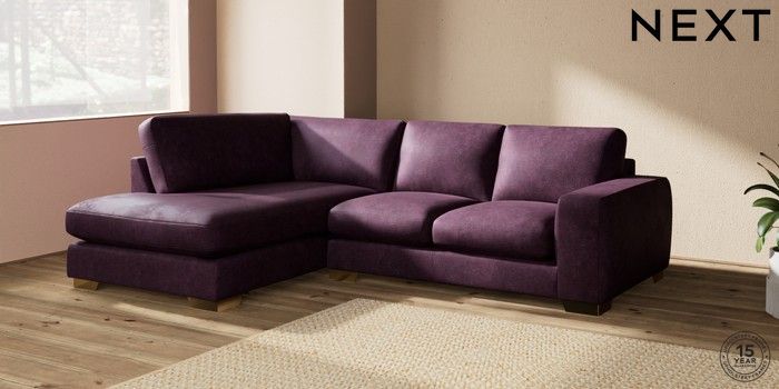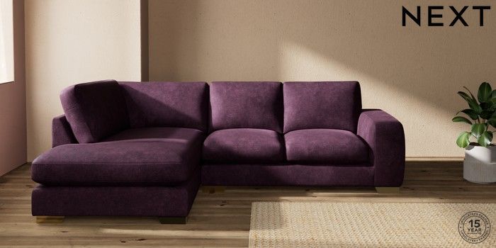 7.2.10 Houghton Deep Sit Medium Corner Chaise - Left Hand Plush Chenille Dark Plum Purple Large Square Angle - Brushed Brass | Made Click here to use our website with more accessibility support, for example screen readers