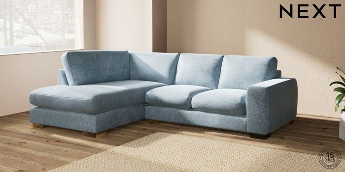 7.2.10 Houghton Deep Sit Medium Corner Chaise - Left Hand Plush Chenille Light Blue Large Square Angle - Brushed Brass | Made Click here to use our website with more accessibility support, for example screen readers