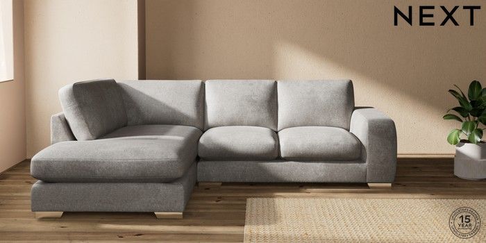 7.2.10 Houghton Deep Sit Medium Corner Chaise - Left Hand Plush Chenille Light Grey Large Square Angle - Chrome Metal | Made Click here to use our website with more accessibility support, for example screen readers