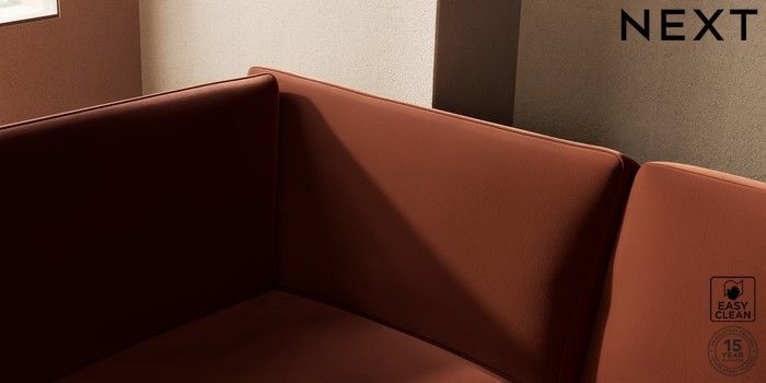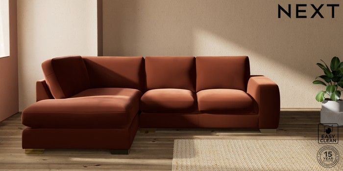 7.2.10 Houghton Deep Sit Medium Corner Chaise - Left Hand Plush Velvet Easy Clean Ginger Orange Large Square Angle - Brushed Brass | Made Click here to use our website with more accessibility support, for example screen readers