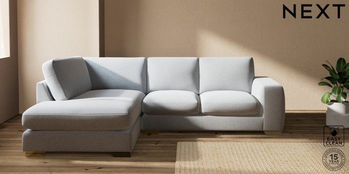 7.2.10 Houghton Deep Sit Medium Corner Chaise - Left Hand Tweedy Blend Easy Clean Light Silver Grey Large Square Angle - Brushed Brass | Made Click here to use our website with more accessibility support, for example screen readers