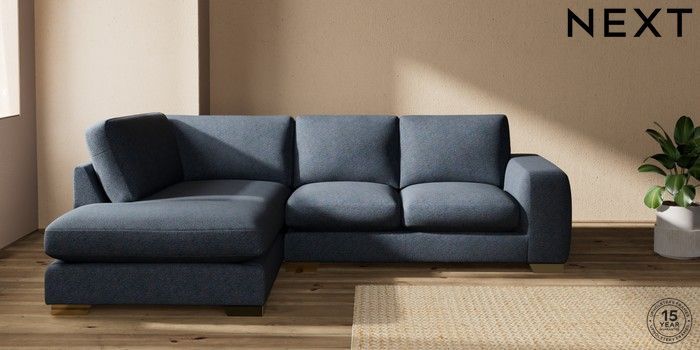 7.2.10 Houghton Deep Sit Medium Corner Chaise - Left Hand Tweedy Chenille Navy Blue Large Square Angle - Brushed Brass | Made Click here to use our website with more accessibility support, for example screen readers