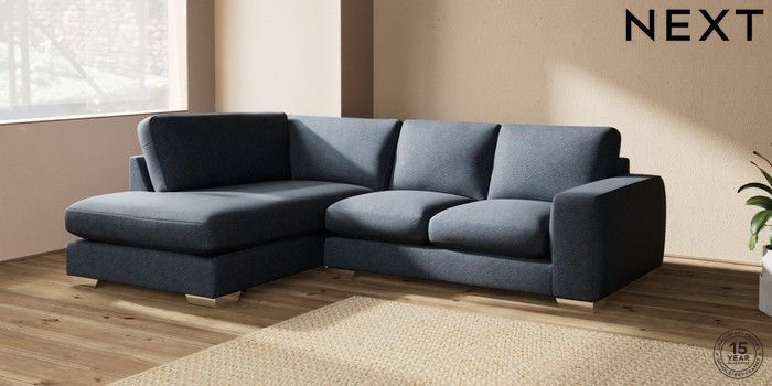 7.2.10 Houghton Deep Sit Medium Corner Chaise - Left Hand Tweedy Chenille Navy Blue Large Square Angle - Chrome Metal | Made Click here to use our website with more accessibility support, for example screen readers