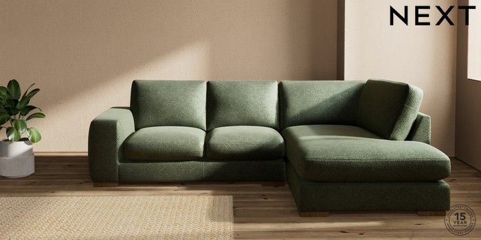 7.2.10 Houghton Deep Sit Medium Corner Chaise - Right Hand Boucle Chenille Dark Moss Green Large Square Angle - Mid | Made Click here to use our website with more accessibility support, for example screen readers