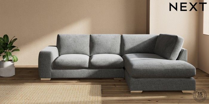 7.2.10 Houghton Deep Sit Medium Corner Chaise - Right Hand Chunky Chenille Dark Grey Large Square Angle - Chrome Metal | Made Click here to use our website with more accessibility support, for example screen readers