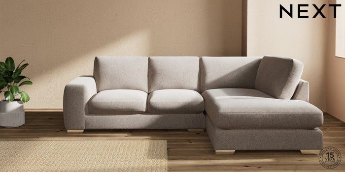 7.2.10 Houghton Deep Sit Medium Corner Chaise - Right Hand Chunky Chenille Light Dove Large Square Angle - Chrome Metal | Made Click here to use our website with more accessibility support, for example screen readers