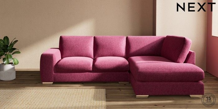 7.2.10 Houghton Deep Sit Medium Corner Chaise - Right Hand Cotswold Chenille Dark Raspberry Pink Large Square Angle - Chrome Metal | Made Click here to use our website with more accessibility support, for example screen readers